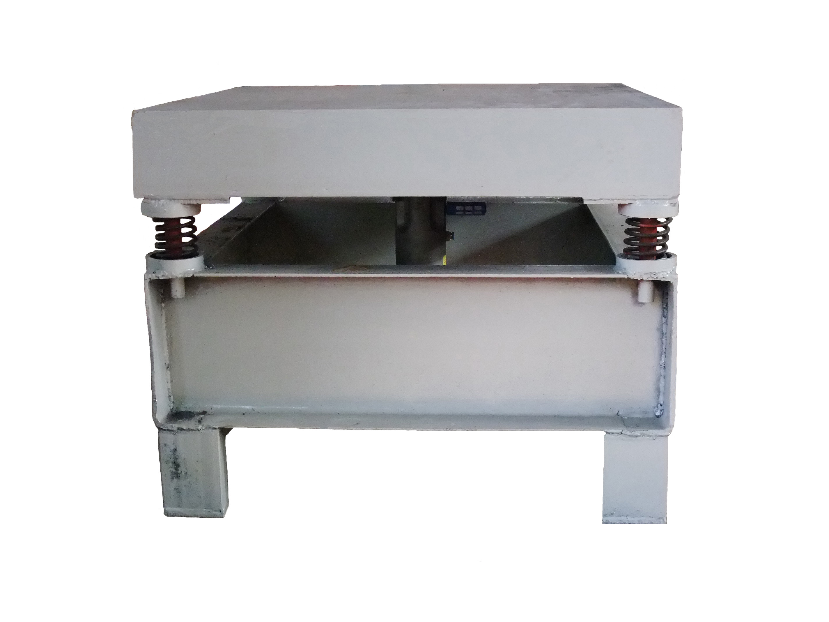 1、设备主体由12mm钢板、槽钢及工字钢焊接而成,尺寸为1m*2m。采用提高加强筋受力的方式,使设备承重力达到1T以上,并确保设备在高负载、高频率的振动下不变形不开裂。